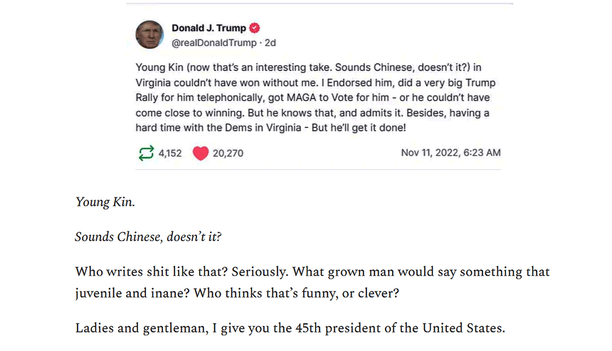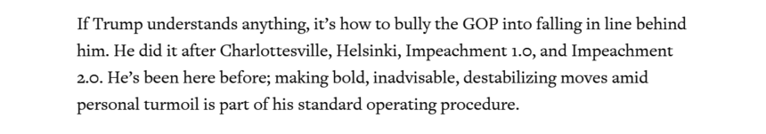 And maybe the 47th, if we don’t take the potential seriously, though it’s safer for him to “own the libs” than it is for him to try to own members of his own party.