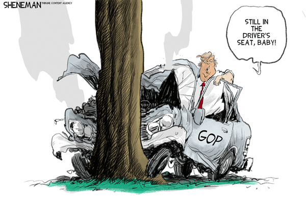 It might be different if Drew Sheneman (Tribune)’s take on the announcement didn’t seem so right on, but Trump has not only failed to take any blame for the collapse of his party but isn’t admitting there was any collapse at all, instead insulting and attacking his critics rather than responding to their criticism.
