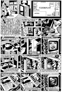 Panel 3, the title, is from a Duke Ellington blues song. The lettering is based on a specimen in an obscure nineteen-twenties lettering book. The square shape of the letters, the initial difficulty in decoding them, the mechanical tone sheets, all reinforce the themes of the strip. The detail of the narrator’s face is redrawn from the panel above in a small box almost the same size as the letters, and can function as the word “I.”