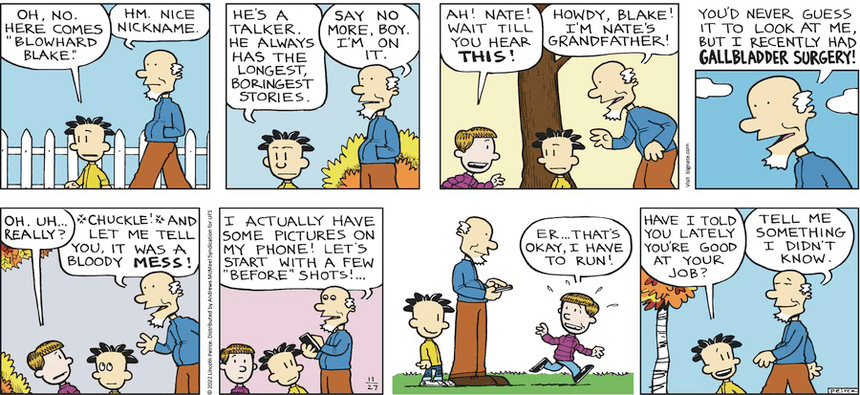 Nate’s grandfather is self-aware enough to know how boring “organ recitals” are, though we old folks share stories with each other, more in solidarity than to be entertaining. My grandfather took the matter too far: He assumed that telling stories at all was the mark of an Old Fart.
