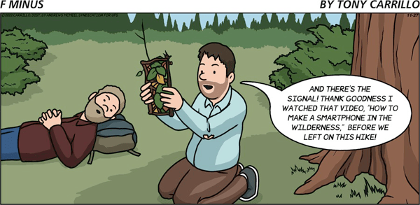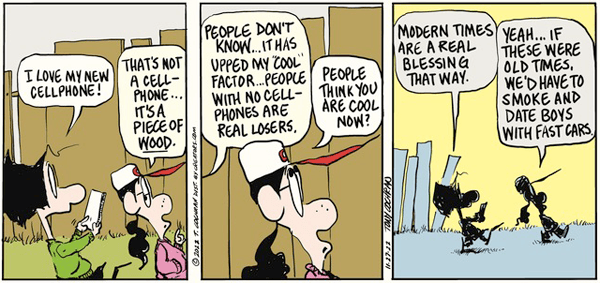 I’m more fascinated at the moment by the Juxtaposition of Agnes’s wooden cell phone proxy and the functional sticks-and-leaves cell phone in today’s F-Minus (AMS).