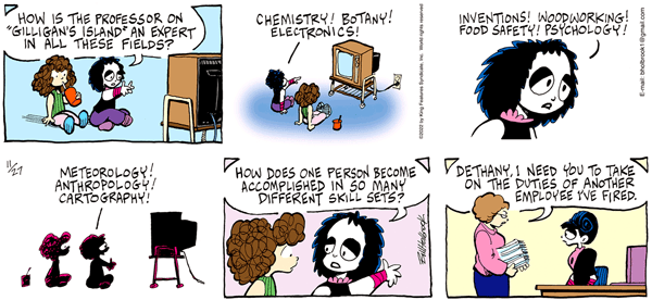 And you may ask yourself, how did I get this wonderful ability to make phones out of sticks? But, as noted in On the Fastrack (KFS), the Professor could have made one out of coconut shells, if there’d been any signals in the atmosphere back then, and I seem to recall him crafting some kind of shortwave radio at least once.