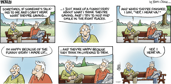In Pickles (AMS), Earl blames his lack of attention on his failing hearing, but I suspect he could listen a little better if he cared a little more.