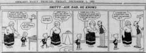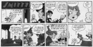 Smitty’s full name was Augustus Smith. He was 13 years old when the strip began, cheerful and energetic. He worked as an office boy for a Mr. Bailey, whose exact sort of business wasn’t important. Mr. Bailey had a stenographer named Ginnie, whom Smitty liked to tease. At home, there were Ma and Pa, and 4-year-old Herby. Smitty’s whole world was full of love and geniality, which was probably a large factor in the strip’s popularity.