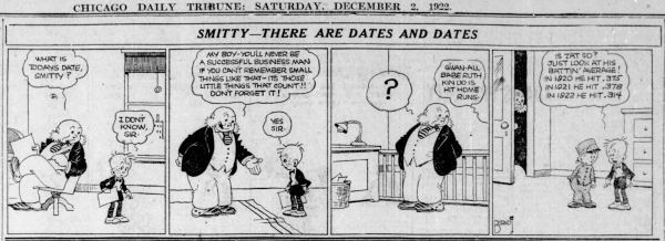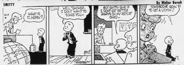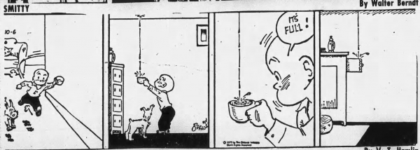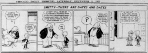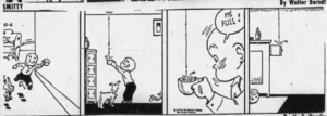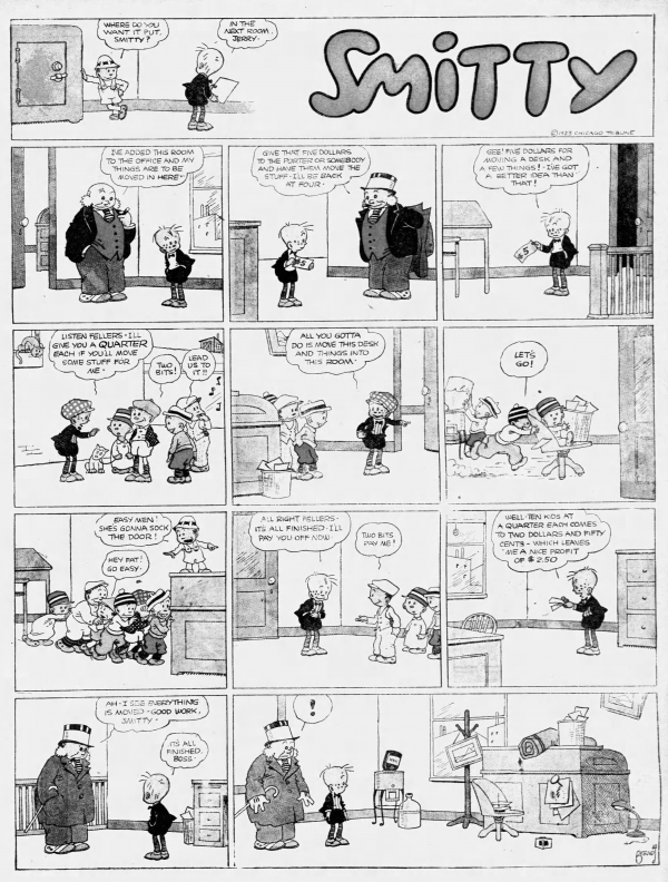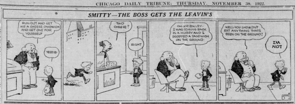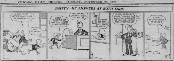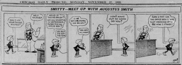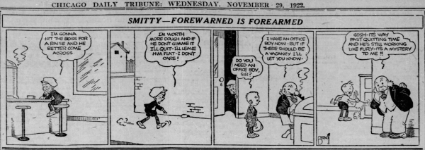 [Berndt] sold Bill the Office Boy to The New York World, but didn’t last long there, due to what might euphemistically be called “creative differences” with his boss. But the same strip, presented to Captain Joseph Patterson, editor of The Chicago Tribune became a success — once Patterson had changed its name to the more succinct Smitty, which he’d gotten by flipping through a phone book. The daily strip was launched on November 27, 1922.
