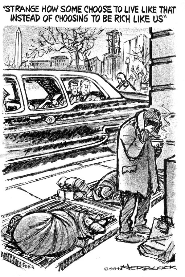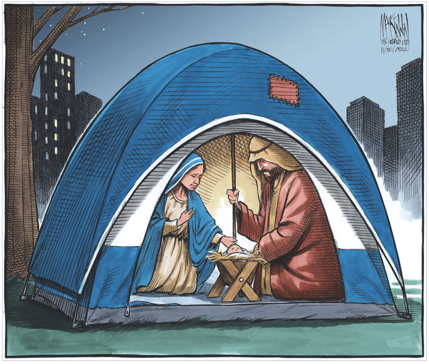 Bruce MacKinnon uses a familiar image to remind readers of the plight of the homeless at this time of year, and, while it’s true that poverty is a problem beyond the holidays, we’re not only entering the season of giving, but the season, as Herblock noted, when utility costs become a greater burden for those who have homes, while the cold itself is an overall threat to those who don’t.
