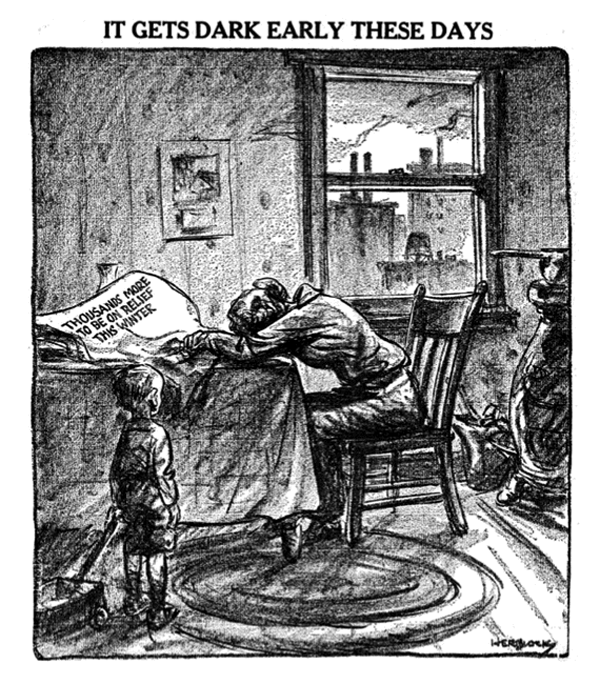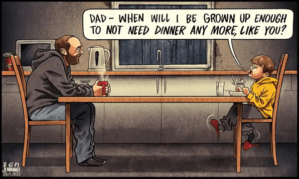 And it is certainly an evergreen topic, as seen in this Ben Jennings commentary on a report that parents in Britain were skipping meals in order to be able to feed their kids. It pairs nicely with Herblock’s 1934 appeal, because the despair of the parents in both not only emphasizes the need for people to step up and help, but makes it plain that, contrary to the cold-hearted dismissal of the Goldwaters and Reagans, poverty is not a conscious choice.