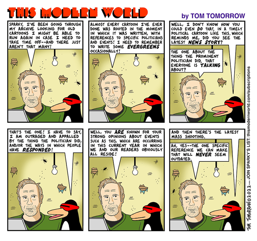 Tom Tomorrow reflects on the fleeting relevance of political cartoons, and he’s right that the more specific a critique, the sooner it becomes irrelevant, or, at least, we should hope it does.