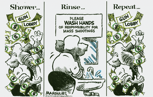 Jimmy Margulies (KFS) cuts to the chase, emphasizing Tom Tomorrow’s point that this is one story that will neither change nor go away, at least as long as SCOTUS considers the purchase of politicians to be protected as Free Speech and insists that Madison was joking when he tied the right to own guns to a need for well-regulated state militias.