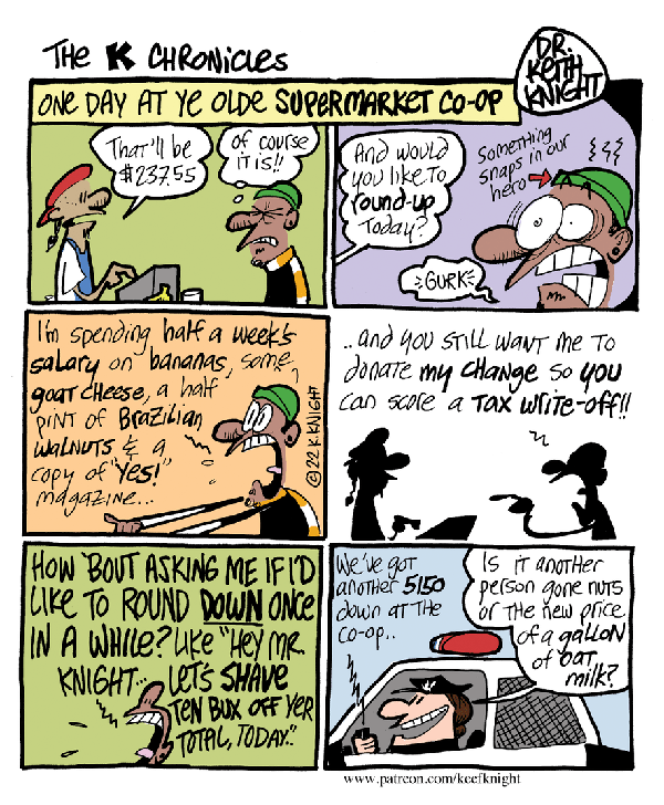 Which calls for me to point out an error that helps people avoid giving all year long: Keith Knight is incorrect that stores are permitted to count customer donations as their own charitable contribution.