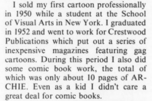 He would contribute gag cartoons to a long list of magazines: Saturday Evening Post, 1000 Jokes, Look, Good Housekeeping, Playboy, McCall’s, Humorama, Christian Science Monitor, Modern Maturity, Family Circle, Cavalier, True Adventure, Broadway Laughs, Saturday Review, Reader’s Digest, and more.