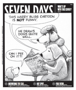 Seven Days hands over eight full tabloid pages to Dan Bolles interviewing Harry Bliss about his days of troubled childhood to his adventurous young adult years to developing a career as a cartoonist to the current happy life in his very own hermitage.