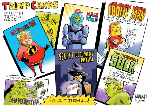 Though you’d never know it from his manly, preening, muscular cards. As Mrs. Betty Bowers noted, “When you buy Donald Trump digital trading cards, you lose over 99 dollars—and he loses over 99 pounds.”