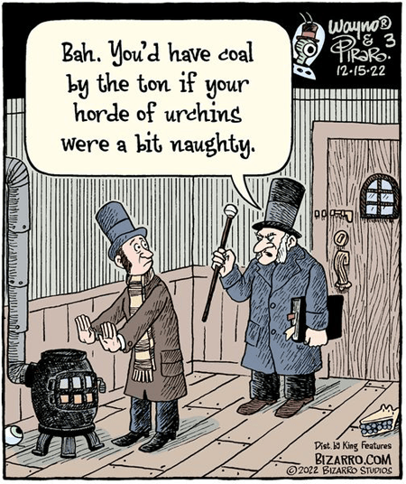 Bizarro (KFS) jokes about bad kids getting coal in their stockings, but, assuming anyone had ever been so cold-hearted in the first place, I don’t know where a hateful parent would even find coal these days.