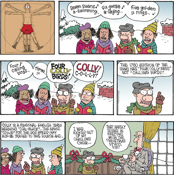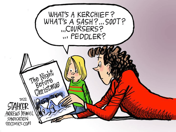 Jeff Stahler (AMS) notes that there are a lot of words which come up this time of year that are also rare to the point of extinction, but this one is on parents, because if you read to your children regularly — and not just from those cheesy, sing-song, easy-reading books but real stories — they’ll build a prodigious vocabulary one word at a time.
