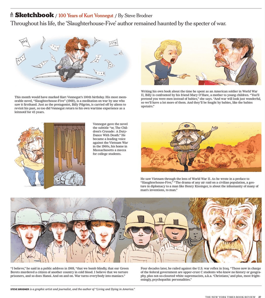 On the topic of books that people should read, Steve Brodner has a full-page salute to Kurt Vonnegut on the back of the NYTimes Book Review today on what would have been Vonnegut’s 100th birthday. This is a pretty lo-res version, but much of the piece focuses on Slaughterhouse Five, Vonnegut’s masterpiece, which was based on his having been a POW in Dresden when it was firebombed.