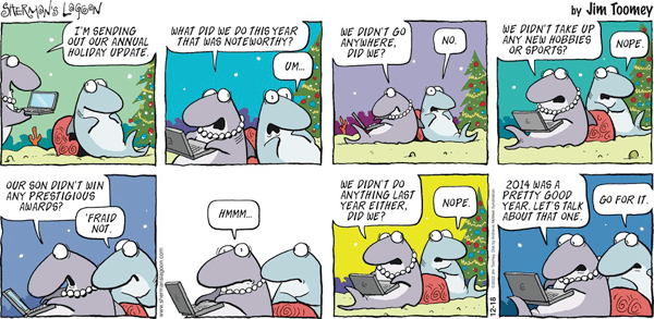 Sherman’s Lagoon (AMS) on the demise of the Christmas Newsletter. Yesterday, I talked about the fables that passed as history in ancient times, but those dubious paeans to powerful leaders had nothing on the self-congratulatory fiction that once poured forth in the form of Christmas Newsletters. Their chief attraction was how much fun it was for satirists to come up with comical, upbeat ways to explain Junior flunking out of college and Dad heading out to Dannemora.