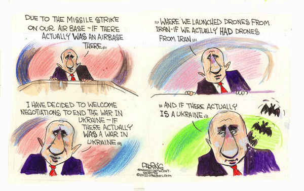His openness to negotiate an end to the war brings to mind the old barroom joke, “Let me up; you’ve had enough!” unless he wants to start the negotiations back where they were 31 years ago, when Ukraine had nuclear weapons on its soil and the crumbling Soviet Union was offering to respect its borders in exchange for disarmament.
