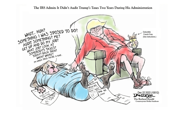 Lord knows, the Delusional Fabulist Party would have plenty of supporters. As Jeff Danziger (Counterpoint) points out, not only did Trump lie about being audited before the 2016 election, but we’ve since learned that the IRS was not performing the legally required audits of his tax returns while he was in office.