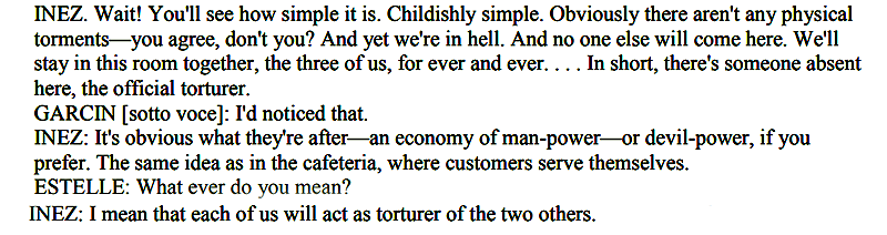 The answer is that, two seasons before the end, I realized the writers had gone from telling stories to simply coining catch-phrases for people to repeat in the office Friday morning, though I did tune in for the final episode, a take-off on Sartre’s No Exit, in which they were all killed in a plane crash and, after Final Judgment, sentenced to be confined to a cell together for their self-centered cruelty, in keeping with Sartre’s script: