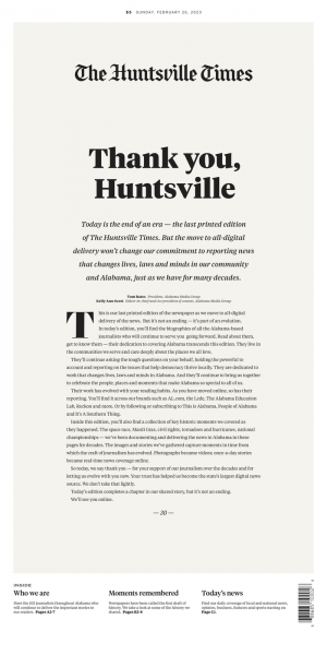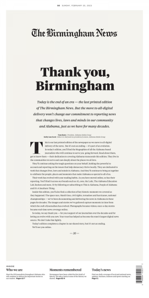 Skip to commentsThe final print editions of The Birmingham News, The Huntsville Times, and The Mobile Press-Register, the three newspapers that comprised Advance Local’s Alabama Media Group, rolled off the presses this morning.