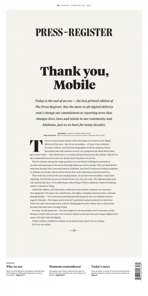 The final editions of the three largest newspapers in Alabama have one unifying theme: Alabama Media Group journalists will continue to evolve with readers and keep delivering high-quality, digital journalism.