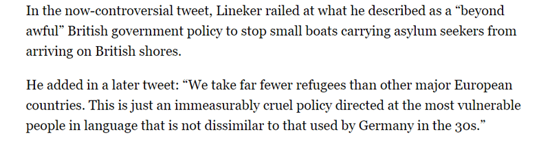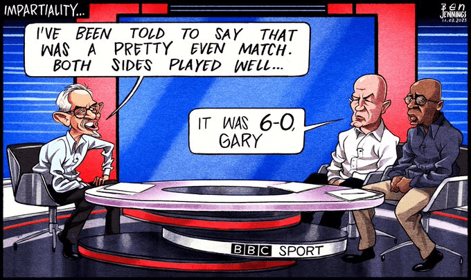 But there’s quite a mood-brightener going on in Britain, and Ben Jennings comments on a leading sports commentator, Gary Lineker, being suspended by the BBC from appearing on Match of the Day for having spoken his mind about the UK’s policy towards migrants.