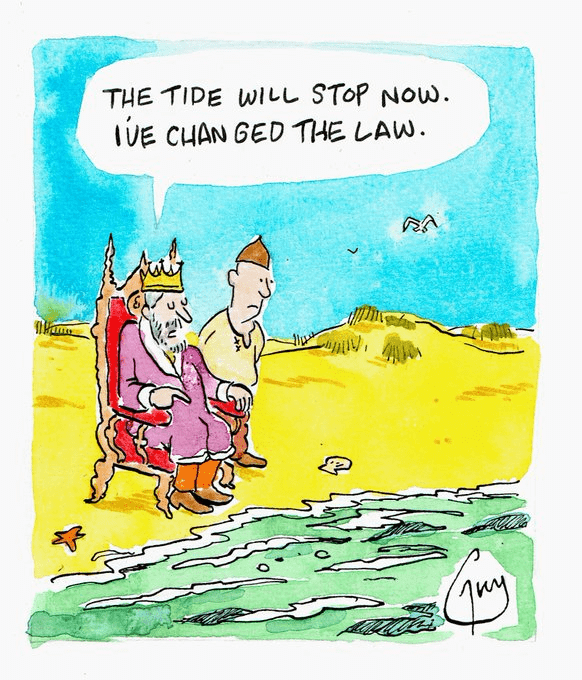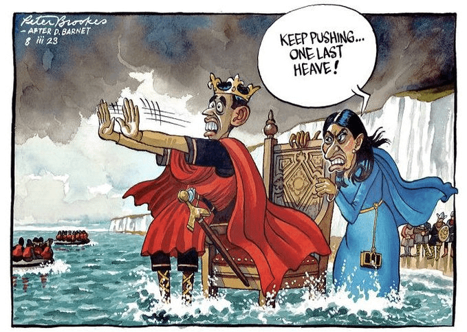 Both Brookes and Venables mock the government’s attempt to stop small boats from landing, by summoning up the legend of King Canute, who tried unsuccessfully to turn back the tide. They suggest that PM Rishi Sunak and Home Secretary Suella Braverman will fail, but Canute had set up the demonstration to show that his power was limited and that only God could alter the tides.