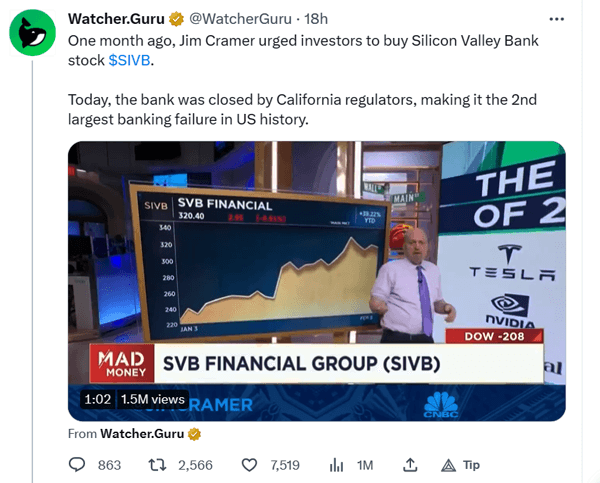 CNBC has been airing a sequel to Jim Cramer’s hilarious 2008 analysis of Bear Stearns, this time using Silicon Valley Bank as his can’t-fail investment tip.