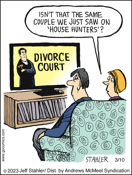 Runner-up goes to Jeff Stahler for this Moderately Confused (AMS) because it happens to touch on a personal revelation. One of those TV shows featured my tiny town (pop 631) in a half-hour segment in which a couple struggled to decide among several lakefront homes.