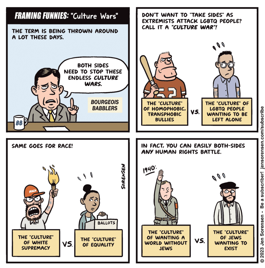 Jen Sorensen demonstrates the foolishness of declaring this uproar a “culture war,” as if we were arguing over which TV show to watch.