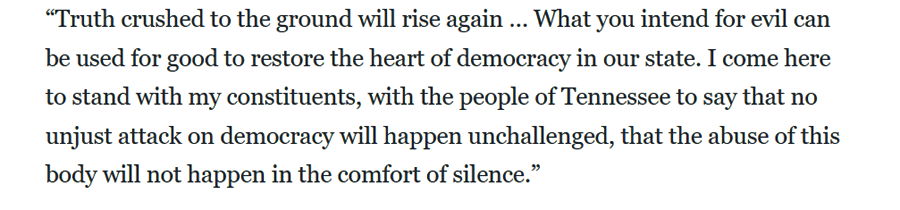 The good news being that, while Republicans expelled Rep. Justin Jones from the Tennessee legislature for protesting in favor of gun laws, the Nashville City Council voted unanimously to appoint him as his own successor and send him right back, whereupon he promised to continue to do his job.