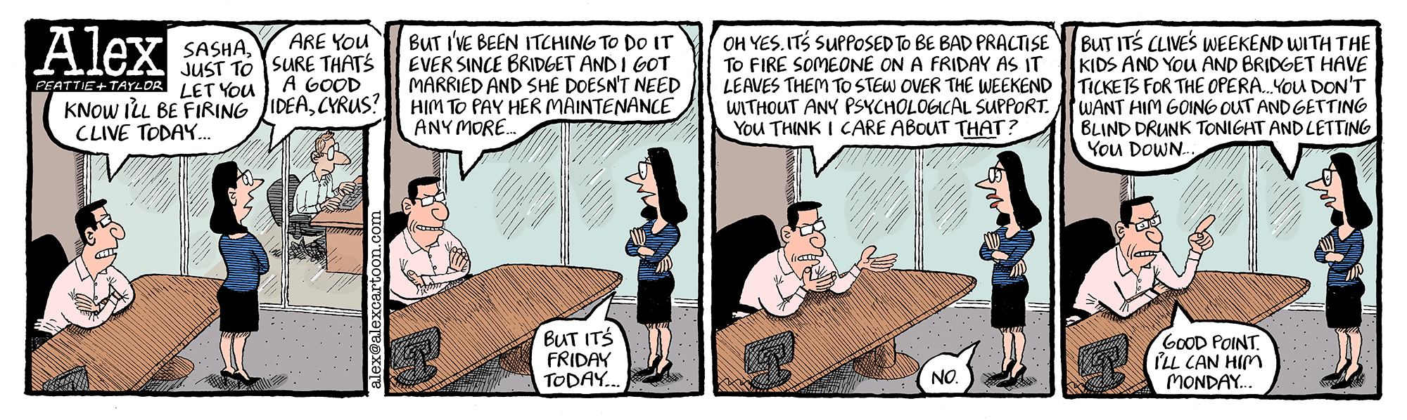 It may seem absurd to have Cyrus firing Clive for such personal reasons, but the last time I got fired, it was because the publisher/owner liked me but his wife didn’t, and the time before that — which was 30 years earlier — it was because we got a new station manager and he and I clashed on a personal level.