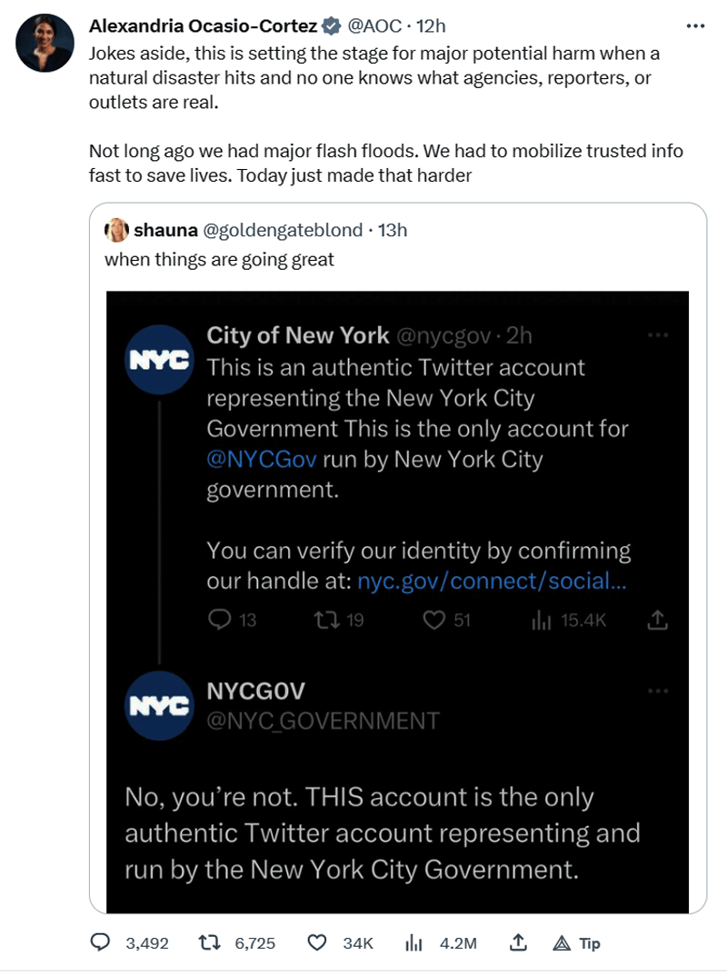 He was successful, however, in eliminating the blue checks that verified accounts as legitimate, which unleashed a number of fakes. There was merriment over this foolish, self-destructive gambit, because few people are going to pay him for checkmarks and the chance to converse with (genuine) famous people has been a major draw for Twitter.
