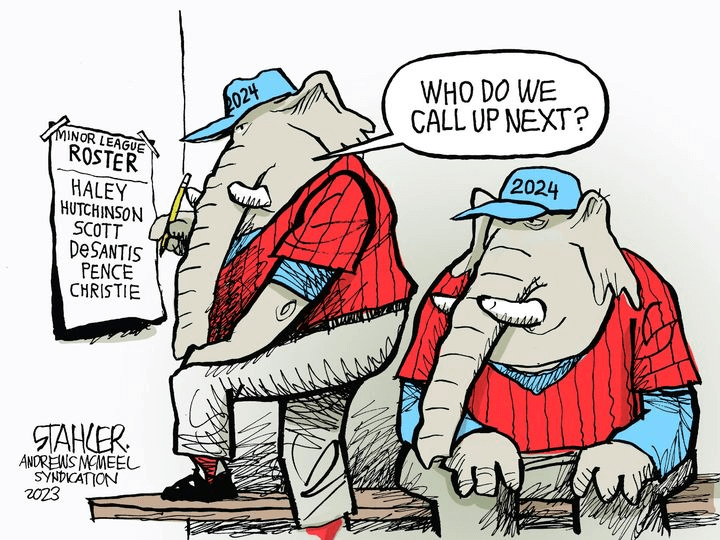To be fair, Jeff Stahler pegs the situation right: The GOP is genuinely having trouble coming up with credible challengers. It’s not surprising that Biden has few rivals; the incumbent rarely does. Perhaps Trump is also seen as a sort of incumbent not to be challenged.