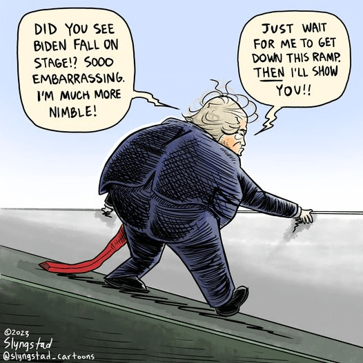 Meanwhile, Benjamin Slyngstad says, Joe Biden tripping over a sandbag on the stage at the Air Force Academy graduation is news because it fits the established “Old Joe Biden” storyline, not because his apparent opponent in 2024 is any quicker on his feet.