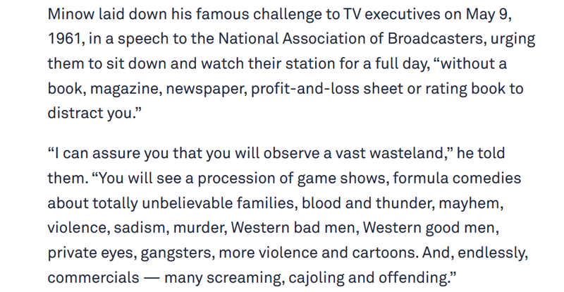 PBS ran an obituary story last month for Newton Minow, JFK’s FCC Chairman, whose disappointment in television spawned a phrase and who inspired public television, but whose viewpoint seems sadly up to date 62 years later: