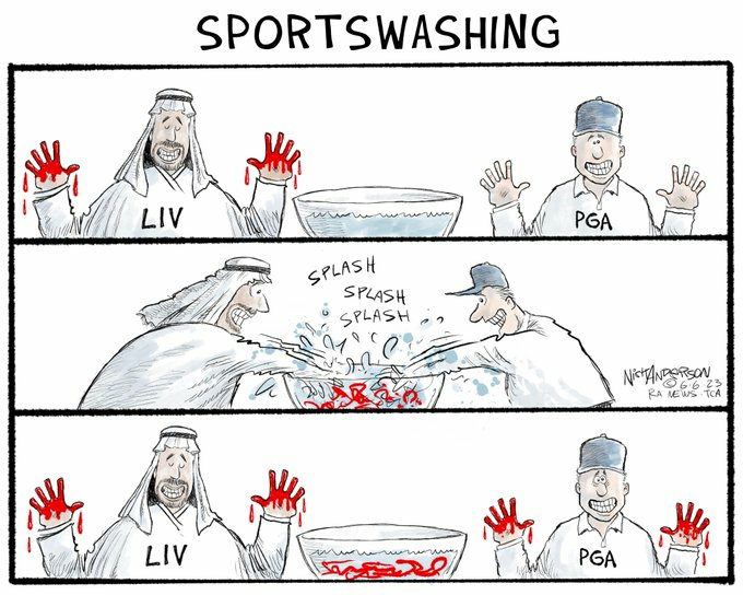 There are any number of bone saw cartoons and memes floating around to comment on the PGA’s merger with Saudi Arabia’s LIV golf league, but Nick Anderson makes the most penetrating claim about what happens when a bloody attempt at sportswashing is endorsed by a previously upright league.