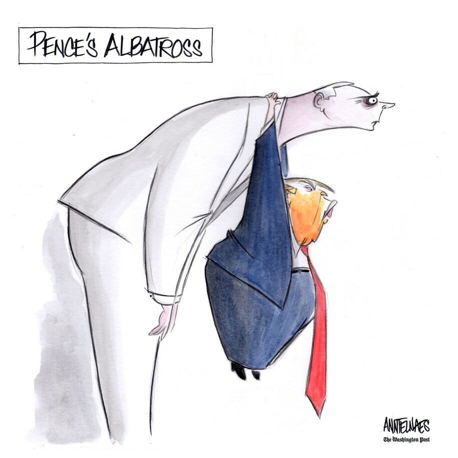 Meanwhile, as Ann Telnaes explains, the other new entrant, Mike Pence, has even less chance than Christie. He, too, could represent the old school GOP, albeit with a touch of evangelistic intolerance, but his association with Trump is a double burden: Moderate conservatives associate him with the authoritarian fringe he served, while fringe dwellers consider him a sell-out.