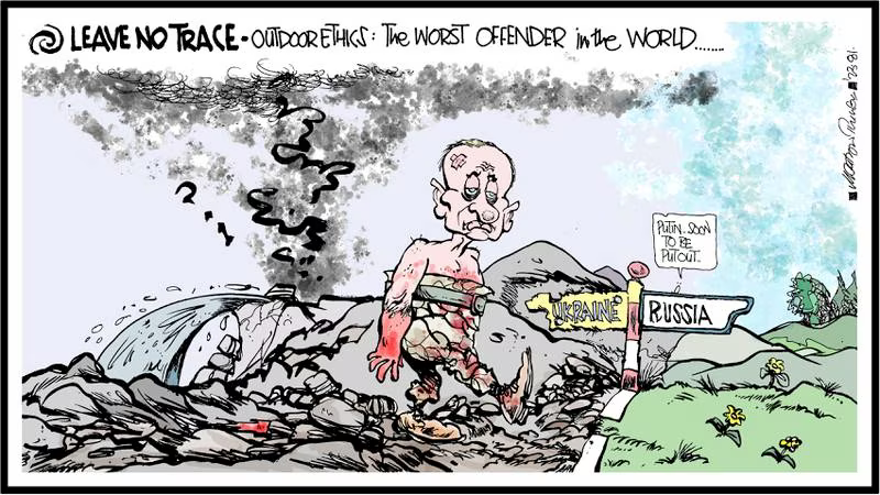 Speaking of human rights horrors, Martyn Turner notes the condition of Vladimir Putin’s soul, with a hope expressed that his failures in Ukraine might bring an end to his leadership. It could happen, but, in the meantime, it takes a particularly naive person to swallow Moscow’s contention that the Ukrainians blew up their own dam, flooding villages and destroying hectares of agricultural land.