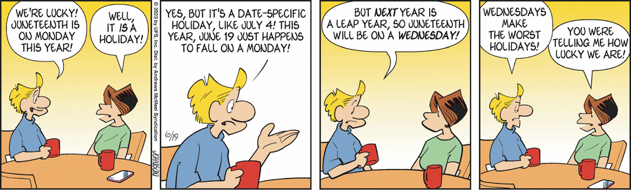 Arlo takes Juneteenth as another day the banks and post offices are closed and is sorry it’s date-specific so he can’t get a three-day holiday each year. Janis is right to bring up the fact of how lucky they are, aside from that.