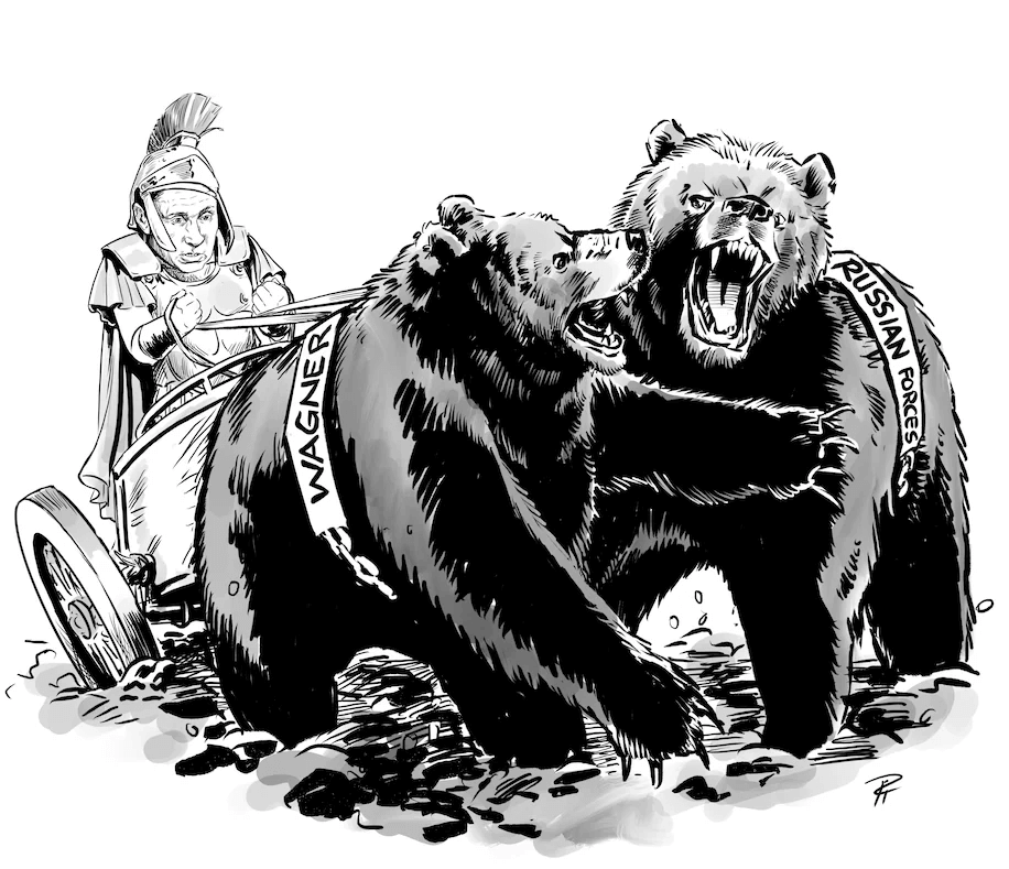 She may be indulging in a little creative exaggeration by showing the two bears of equal size, but the mass of the Russian army does compensate for the far better training of the Wagner group, and, meanwhile, the consternation of her bogged down Roman conqueror is spot on.