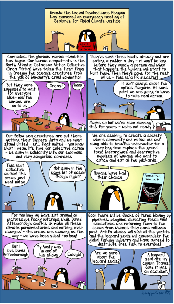 Skip to commentsFirst today, we’ll address a political/environmental crisis of great importance. First Dog on the Moon, whom I would trust with something or other, probably, reports that Brenda reports that the attacks on boats by orcas in the North Atlantic are a case of jumping the gun on what was intended to be a wider movement.