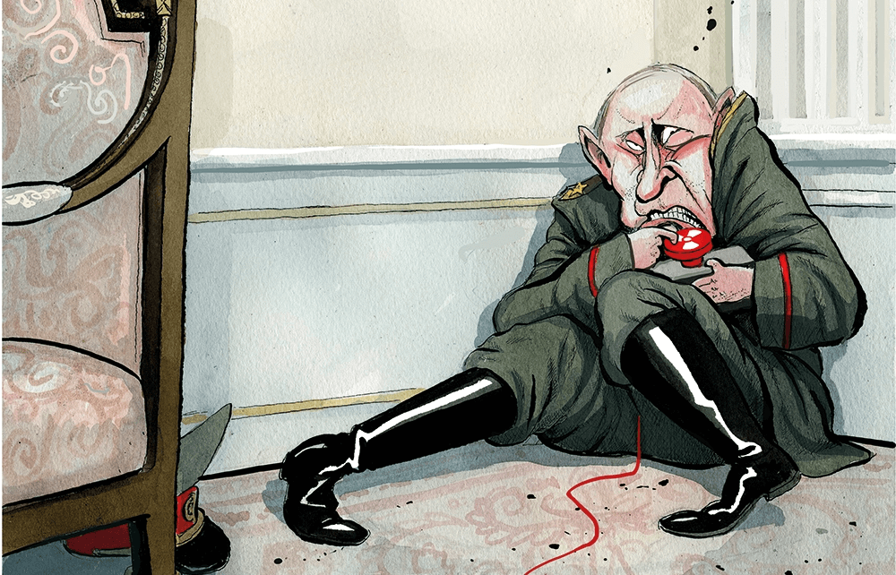 Morten Morland‘s piece is not a political cartoon, though it could be, but is the illustration for a Spectator article that outlines the growing desperation Putin feels as his glorious attempt to add Ukraine to Russian territory has gone seriously awry.