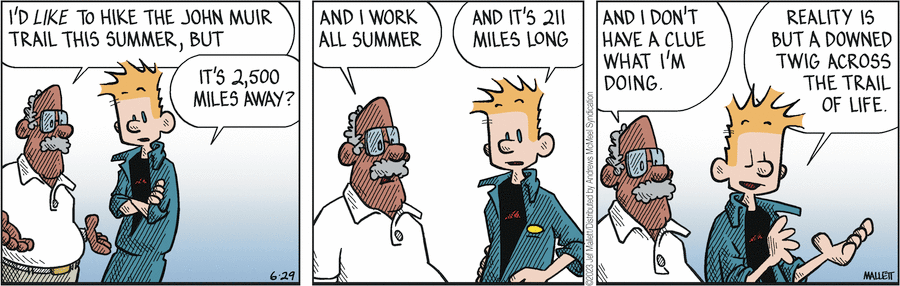 For a moment this past week, I thought Frazz (AMS) was going to win an Unfortunate Timing Award along with the Titan disaster. Fortunately, Dr. Spaetzle is only tackling the John Muir Trail virtually.