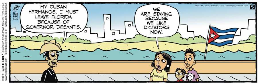 So I’ll let Lalo Alcaraz handle the issue of why people who fled a dictator in Cuba seem so resistant to welcoming other refugees from other dictators, though I guess he only means our own dictator.