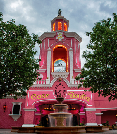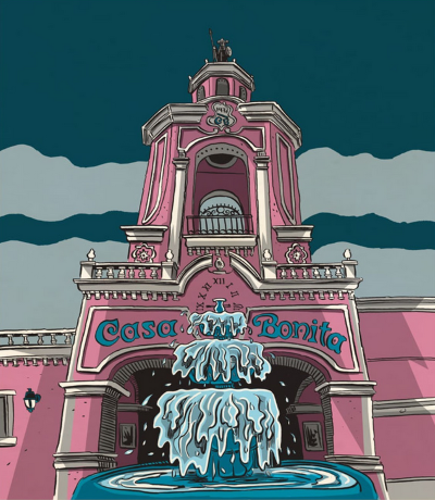 Logos are another matter. The Casa Bonita name is traditionally done in a special typeface name that was registered as a service mark in 1974 and is still active. But Krumpholz didn’t use the actual logo. He drew a cartoon version of the sign on the outside of the building.
