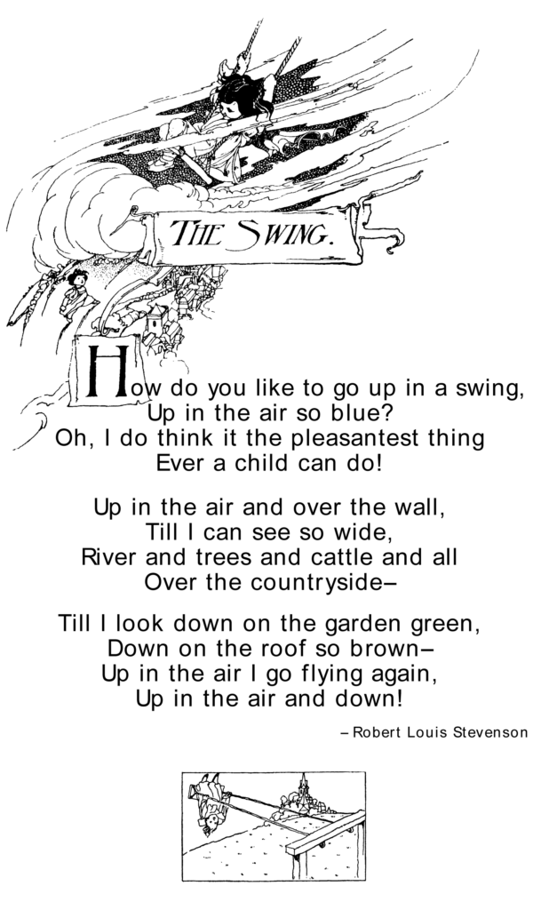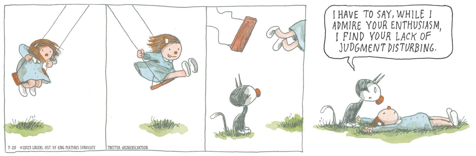 Gotta disagree with the cat in Macanudo (KFS), as well as with whoever decreed that wooden swings must be replaced with safe rubber slings that make bailing out harder and less momentarily exuberant.