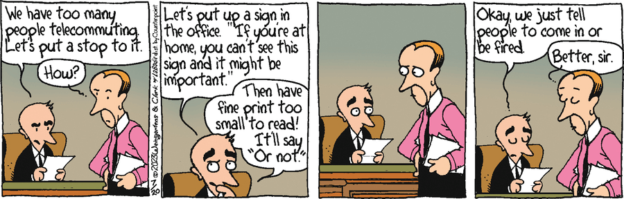 A little more politics, this from Barney & Clyde (Counterpoint). Now that the pandemic is over, the bigwigs are trying to get their workers to stop working from home.