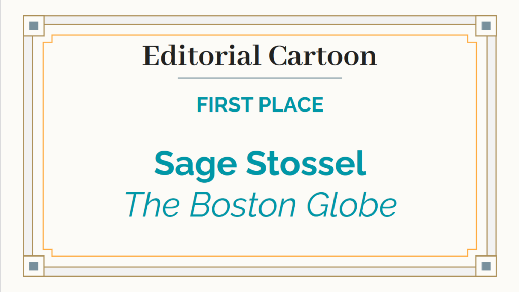 They named Sage Stossel, of The Boston Globe, as the winner in the Editorial Cartooning category.